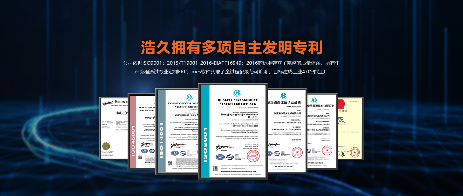 浩久擁有多項自主發(fā)明專利。公司依據(jù)ISO9001GB/T19001-2016和IATF:2016的標準建立了完整的質量體系,所有生產流程通過專業(yè)定制ERP,mes軟件實現(xiàn)了全過程記錄與可追溯,目標建成工業(yè)4.0智能工廠。
